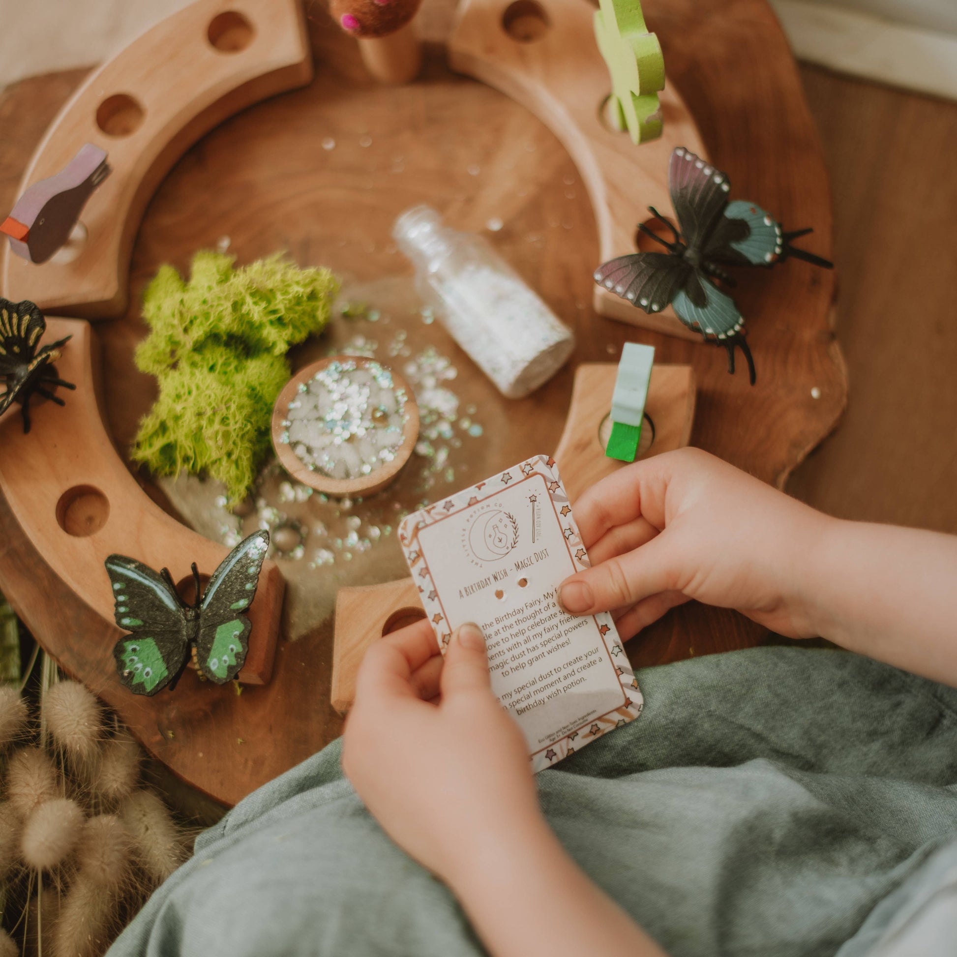 HAPPY BIRTHDAY! I am the Birthday Fairy. My feet twinkle at the thought of a party and I love to help celebrate special moments with all my fairy friends. My magic dust has special powers to help grant wishes! A new addition to our colour fairies magic dust, this birthday fairy potion is perfect for the birthday child or for party favours and gifts. Add this magic dust to your potion making for extra fizz, sparkle and magic. For optimum fizz, slowly add teaspoons of water to the magic dust in a small bowl. Contains: Fizzing ingredient in 30ml PET plastic bottle with a bamboo cap. Ingredients: Bicarb, citric acid, food dye, mica and biodegradable glitter