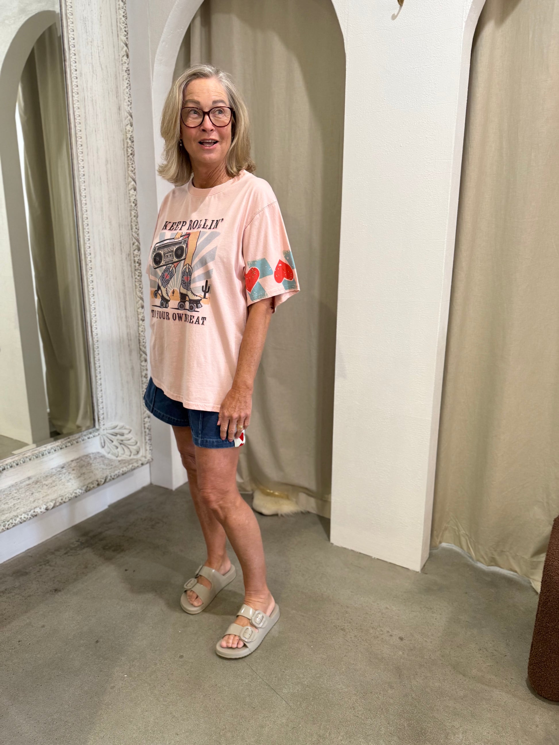 A playful nod to retro days, the Keep Rollin’ Tee is crafted from soft cotton with a relaxed fit for all-day comfort. Featuring fun sleeve accents and a bold roller-skate graphic, it’s made for easy styling with denim, skirts, or your favourite joggers — perfect for rolling to your own beat.