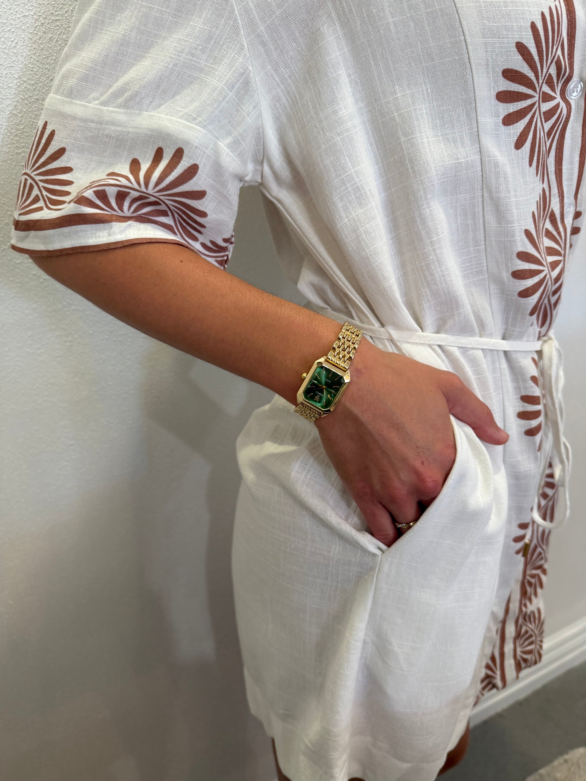 Finished with warm cocoa-toned embroidered detailing, it’s the kind of piece you’ll reach for on sunny days when you want to look polished but feel completely comfortable.