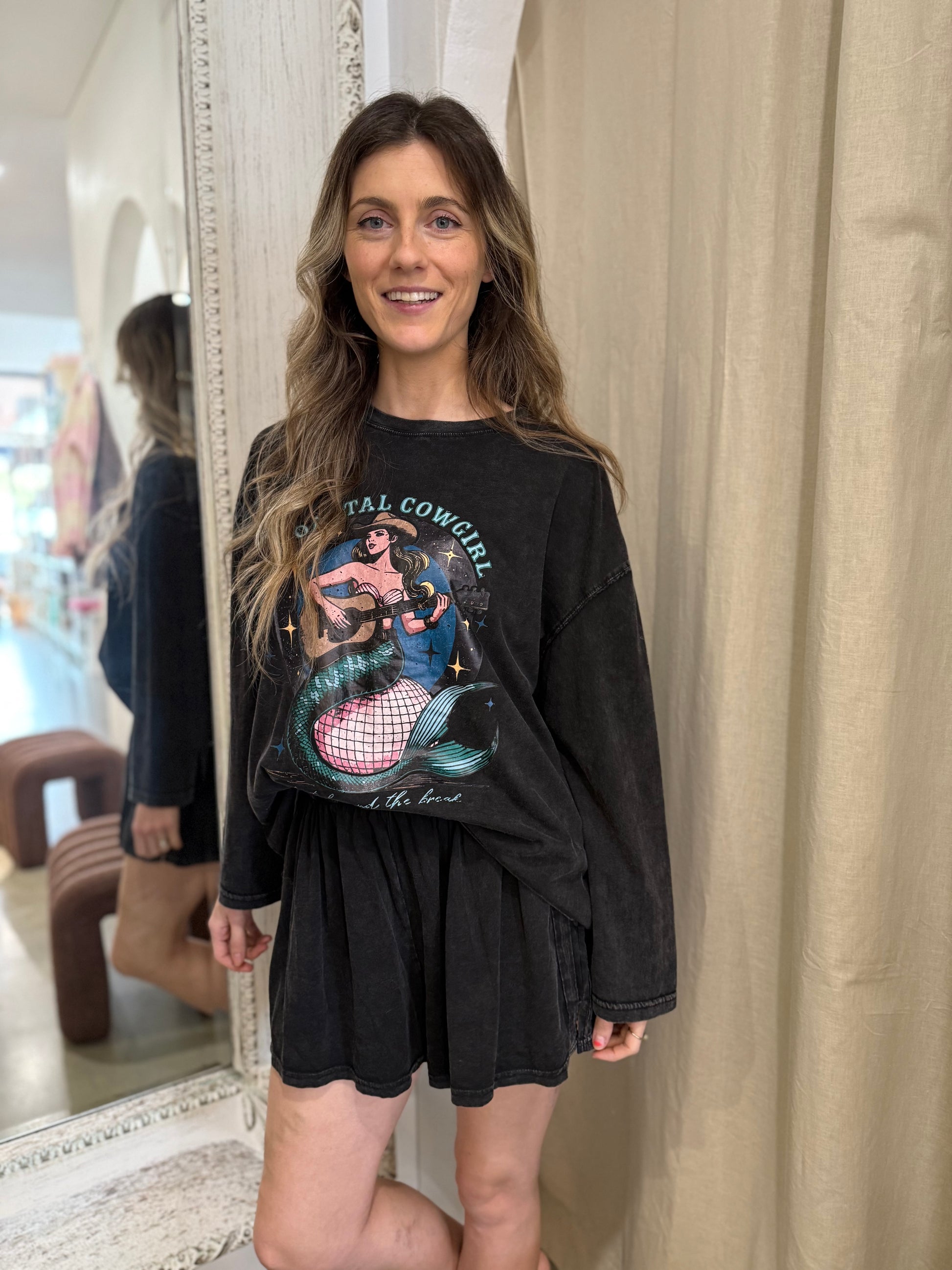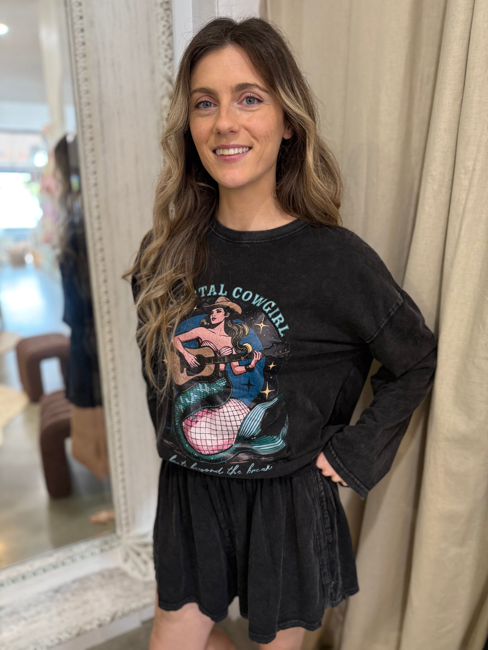 Channel effortless beachside energy in the Coastal Cowgirl Set — a two-piece dream featuring a relaxed tee with a mermaid cowgirl graphic and matching washed shorts. The perfect throw-on-and-go set for slow weekends, road trips, or lounging in laid-back style.