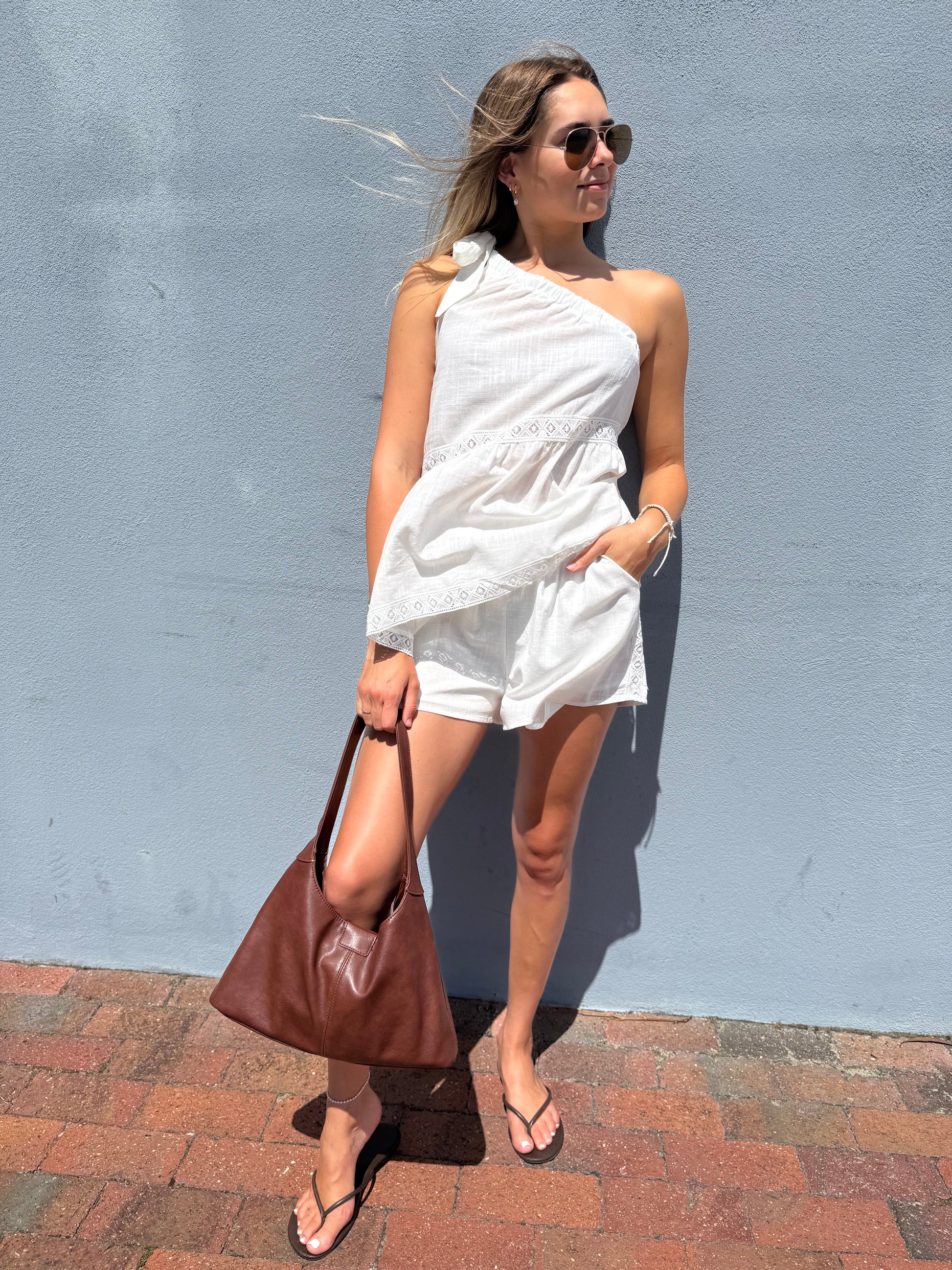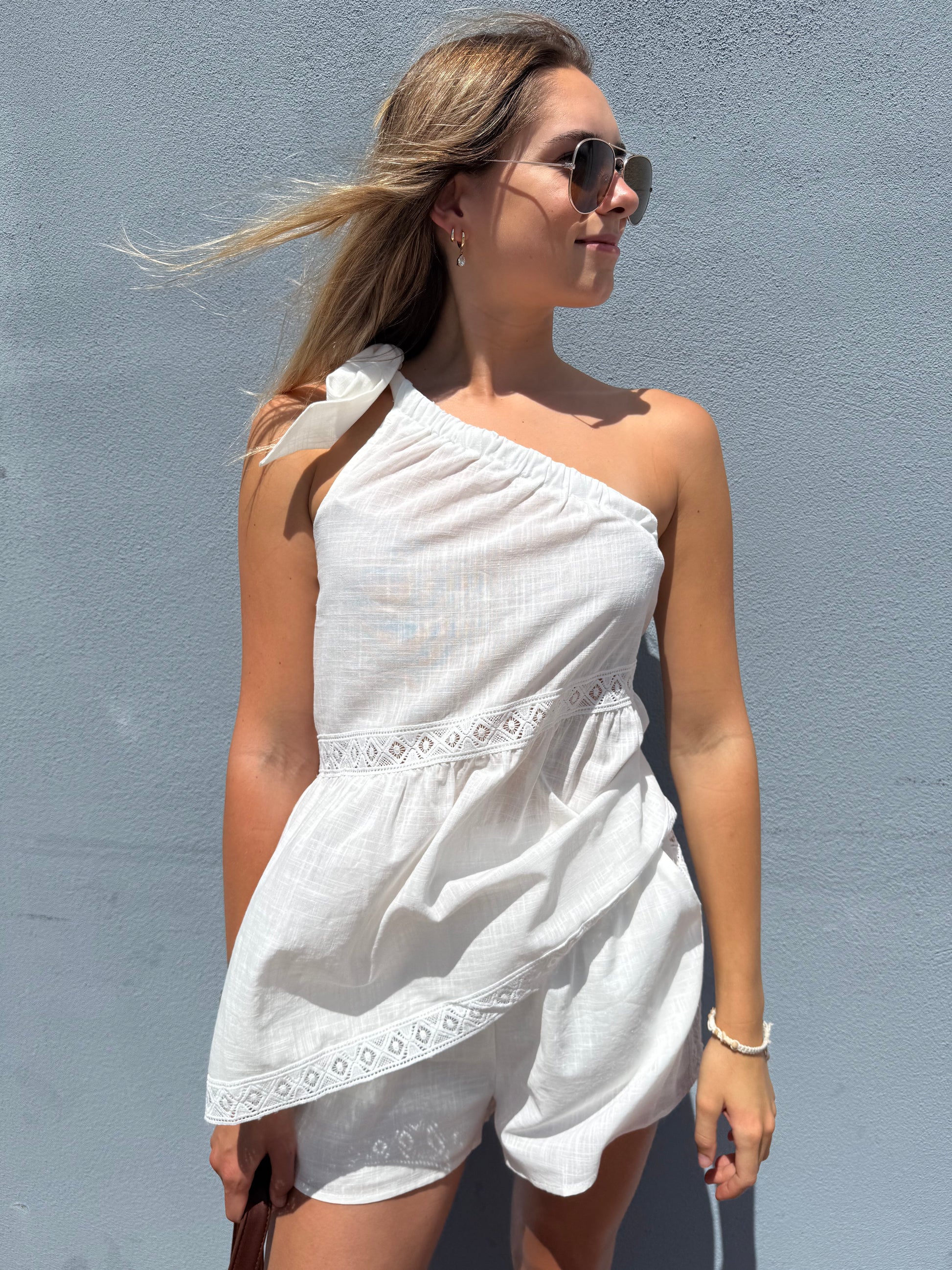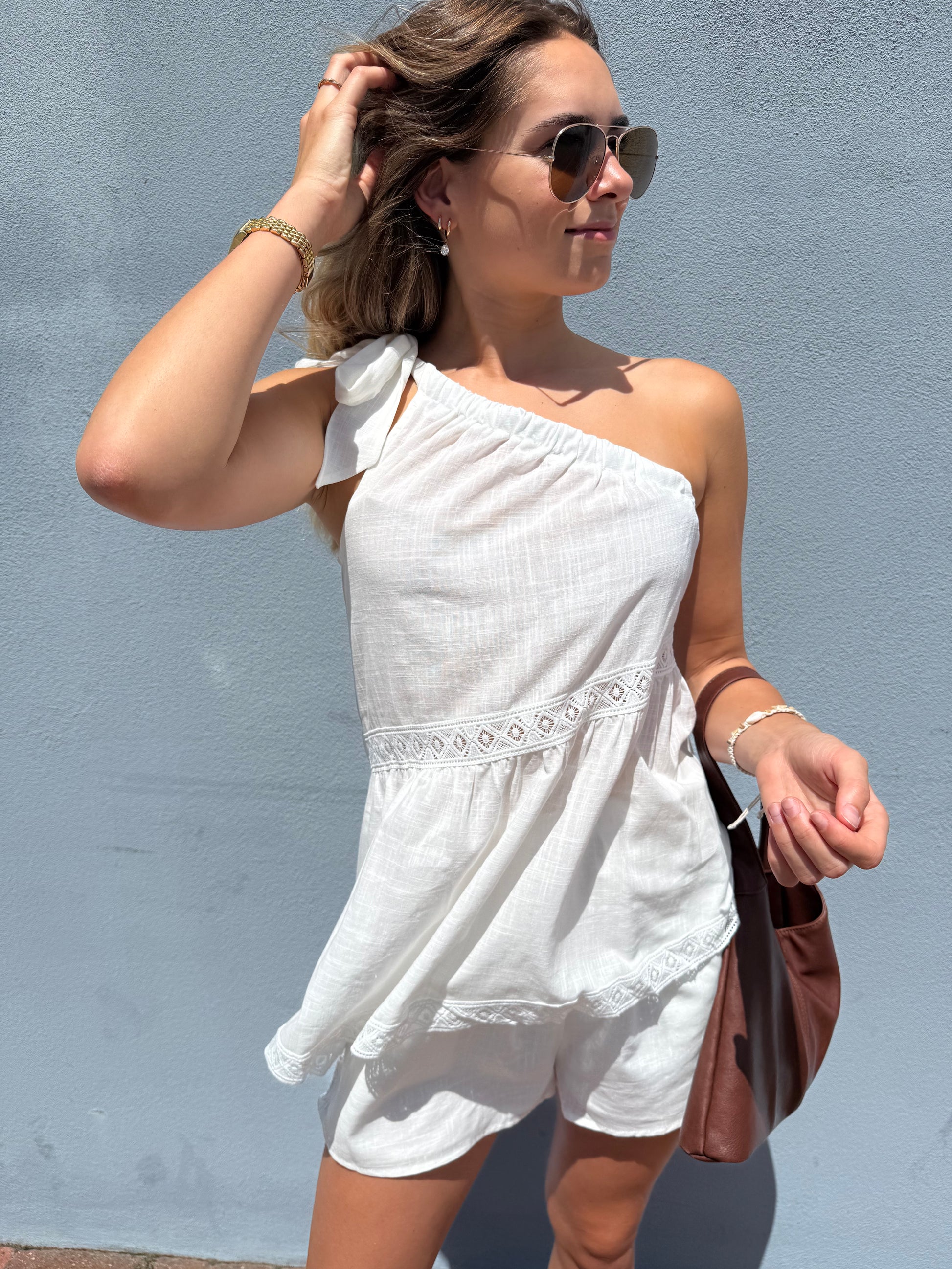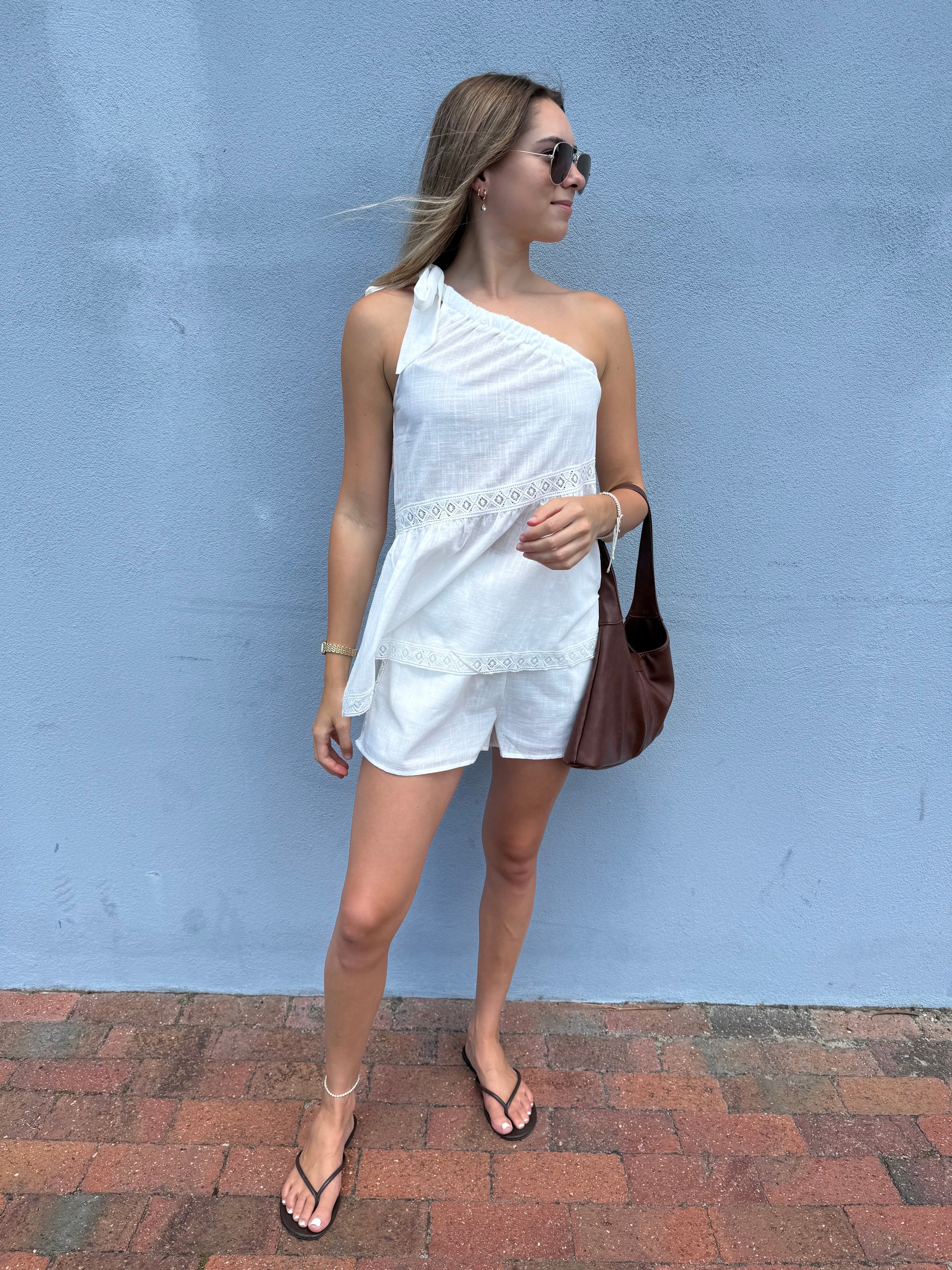 Easy, breezy and made for sun-filled days, the Isla Set is your go-to summer duo. Crafted from lightweight 100% cotton, this two-piece set features a relaxed one-shoulder top with an adjustable tie and soft elastic neckline, paired with comfortable elastic-waist shorts for effortless wear.