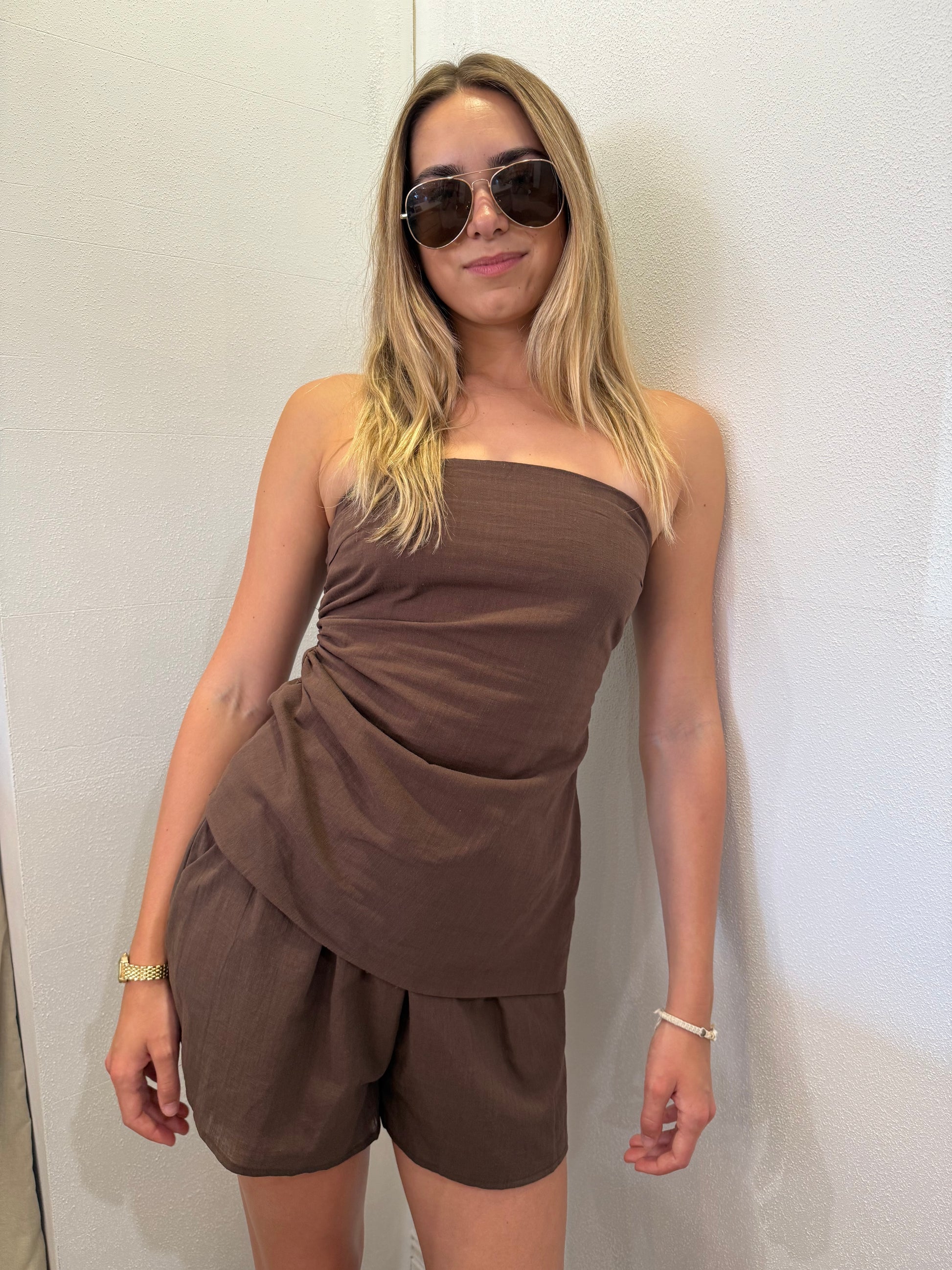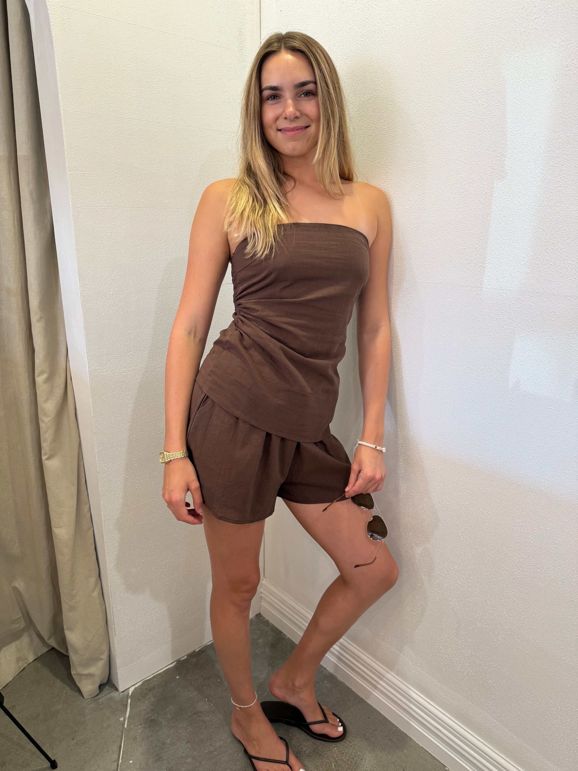 The Luca Set is your effortless warm-weather staple. Crafted from breathable 100% cotton, this two-piece set features a softly structured strapless top with gentle draping and a comfortable shirred back for a secure, flattering fit. Paired with relaxed elastic-waist shorts, Luca is designed for easy days that still feel put together.