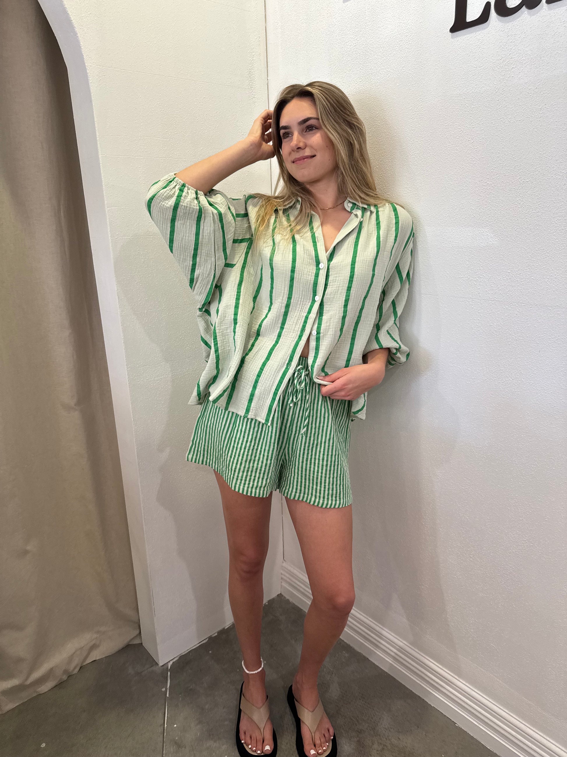 An effortless blend of coastal charm and comfort — the Shae Stripe Shirt is the piece you’ll reach for on repeat. Designed in a soft, breathable cotton with bold green stripes, it features a relaxed fit, gathered sleeves, and a gently curved high-low hem that drapes beautifully.
