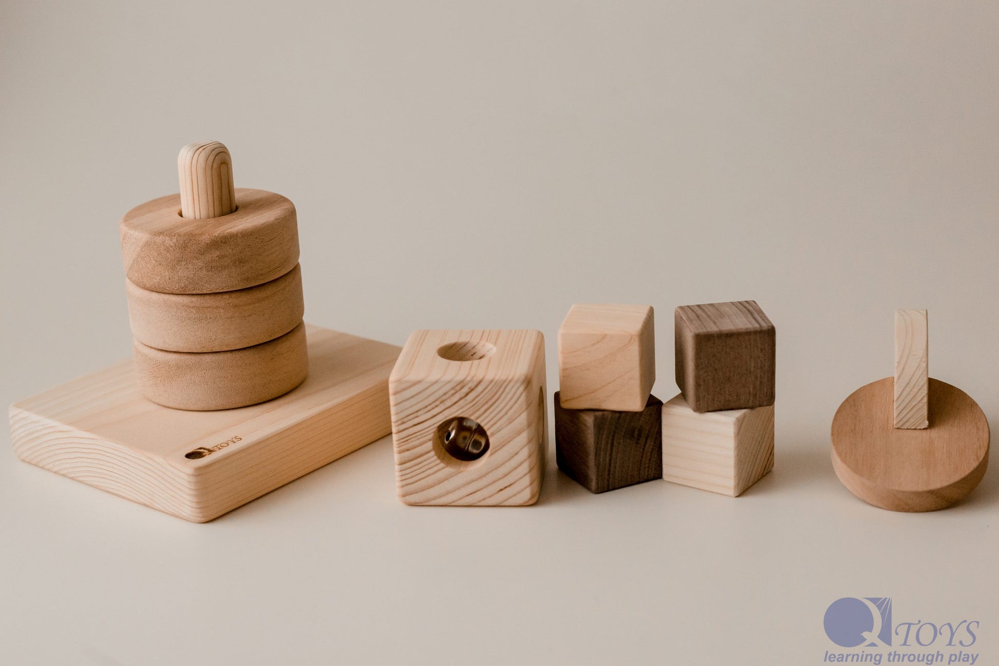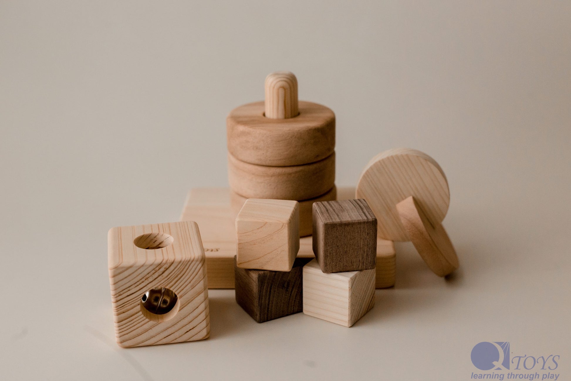The perfect gift set for anyone welcoming a little one into the world. This set is made up of QToys Montessori inspired toys. Includes: Dual Discs, Montessori Vertical ring stacker, Cube Rattle & 4 blocks