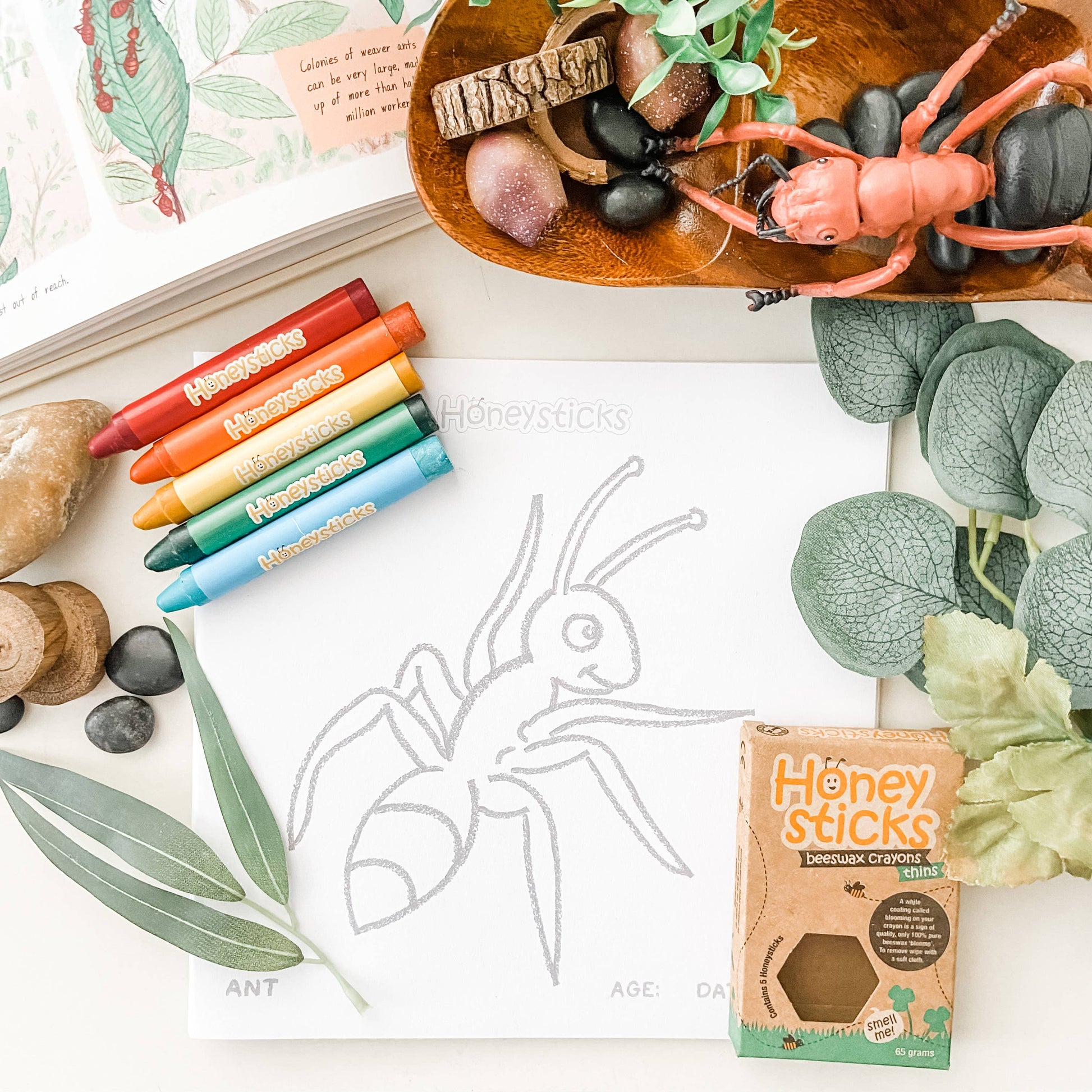 Honeysticks Thins are the size of a traditional crayon, designed with older children in mind, 8 vibrant colours, lovingly made in New Zealand using 100% pure New Zealand beeswax.